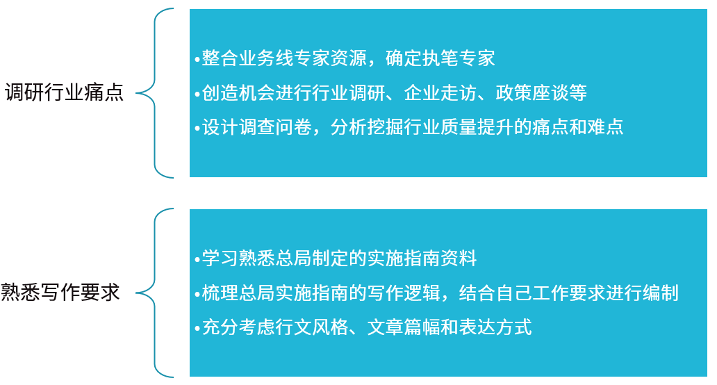 实施指南编制工作的核心,在于整合业务线的专家优势,认真调研特定行业的痛点和难点,并以相对规范性的写作要求呈现出文章观点,便于实施指南更具有可参考性和可传播性。