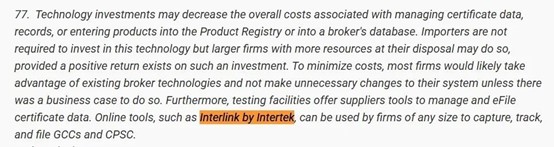 Intertek作为CPSC官方认可的第三方测试实验室,深度参与了CPSC的eFiling Beta Pilot测试。全新升级行业领先水平的InterLink 2.0平台, 也被美国《联邦公报》(Federal Register)发布的16 CFR 第 1110部分最终规则列举为eFiling在线工具的范例:InterLink by Intertek。