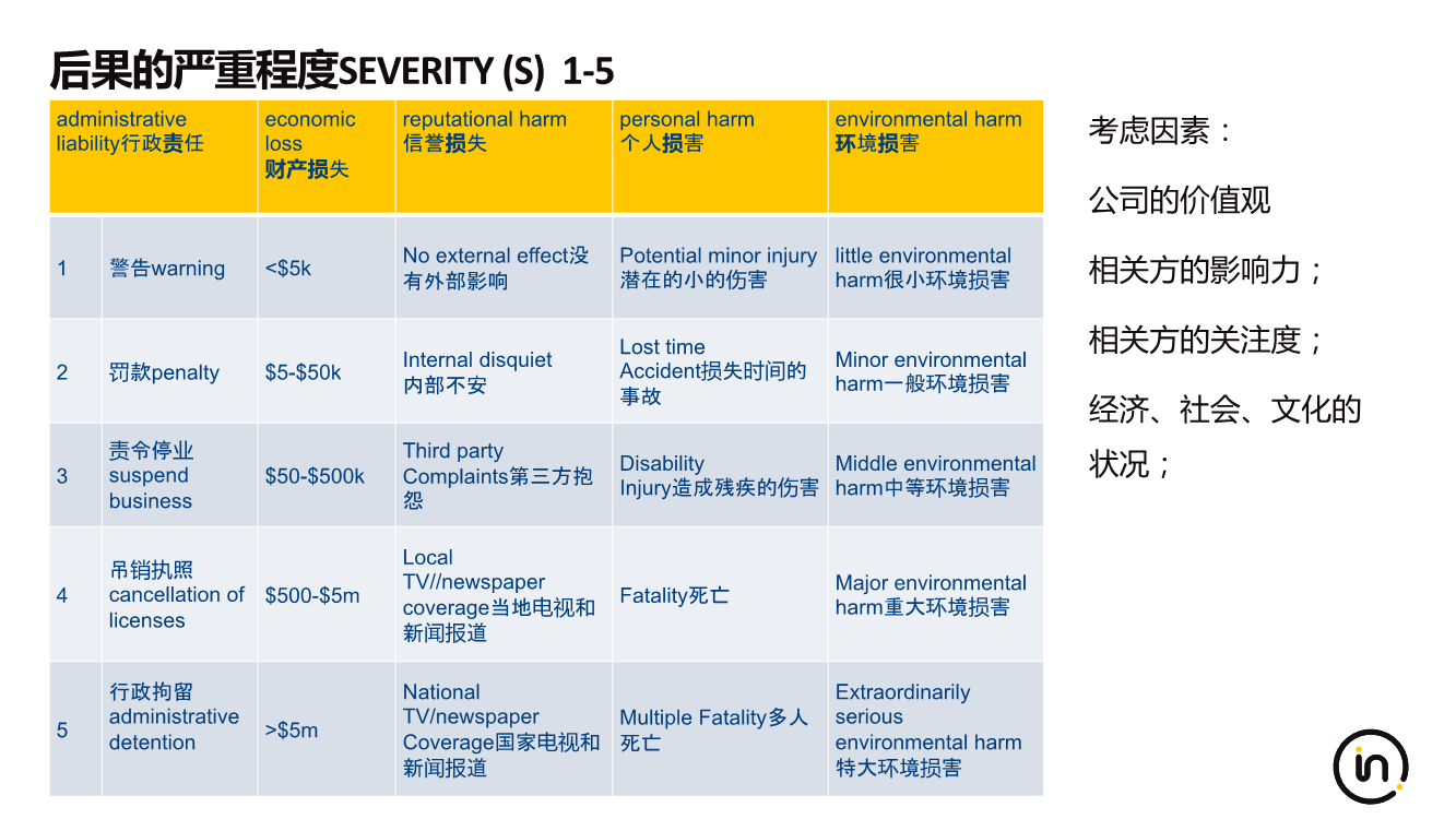 各个管理体系都是建立在风险管控的基础上的,而不同的管理体系正如前面所说侧重点有所不同。虽然各个管理体系涉及的风险都需要管控,但是这些风险对于企业的影响和重要程度不同。我们不能一味的强调某个管理体系的重要性,而忽视了各管理体系为企业整体战略目标服务的宗旨。因此如图二所示,在考虑后果的严重程度时,要考虑风险事件对各利益相关方的影响,例如综合考虑行政责任、财产损失、信誉损失、个人损害、环境损害等,权衡不同相关方的利益和对企业的重要性,统一风险评价准则,将这些不同管理体系涉及的风险进行统一的排序,然后根据风险程度的不同和优先顺序确定管控的优先顺序、资源的投入和管控的力度,从而实现企业整体管理绩效最优。