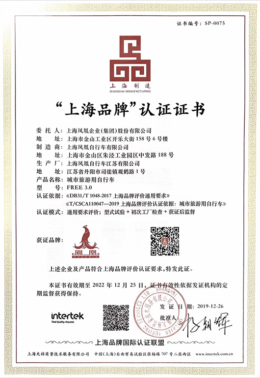 6月9日,上海市市场监督管理局主办“世界认可日”主题活动,为“上海品牌”认证新获证企业举行颁证仪式。Intertek天祥集团作为上海品牌认证国际联盟成员机构,为上海凤凰企业(集团)股份有限公司的城市旅游用自行车(以下简称“凤凰自行车”)颁发上海品牌认证证书。