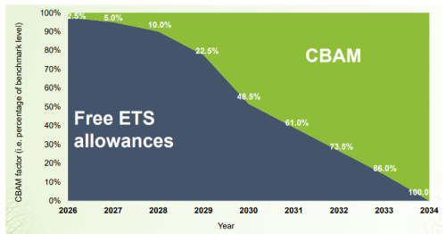 随着免费配额的减少,CBAM将逐步引入:2026年,2.5%;2027年,5%;2028年,10%;2029年,22.5%;2030年,48.5%;2031年,61%;2032年,73.5%;2033年,86%;2034,100%。